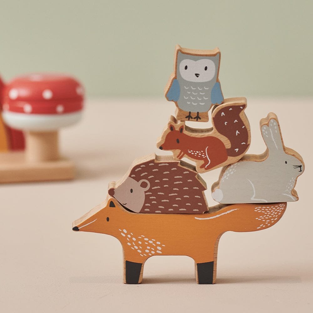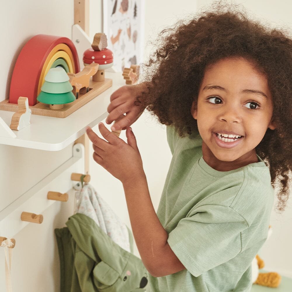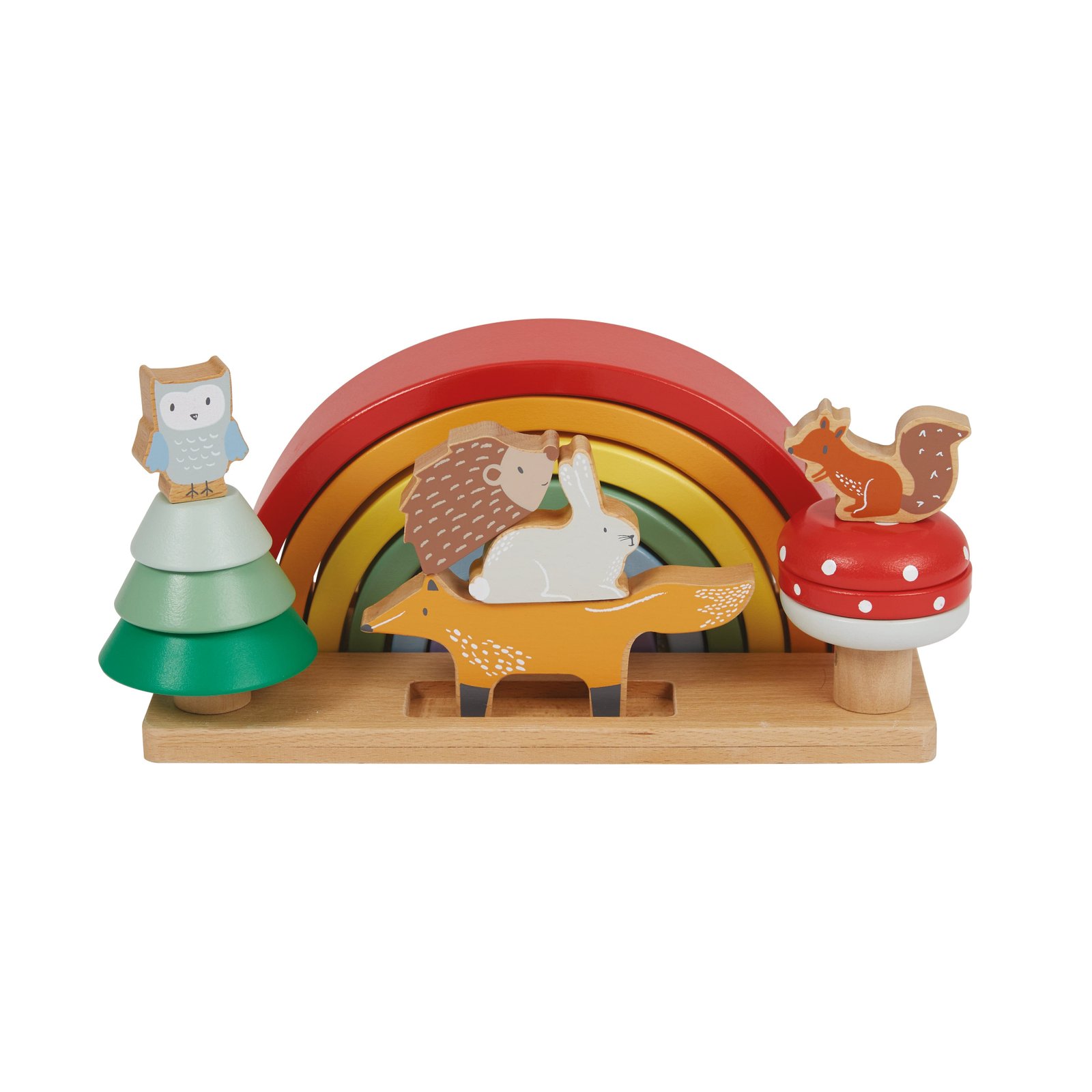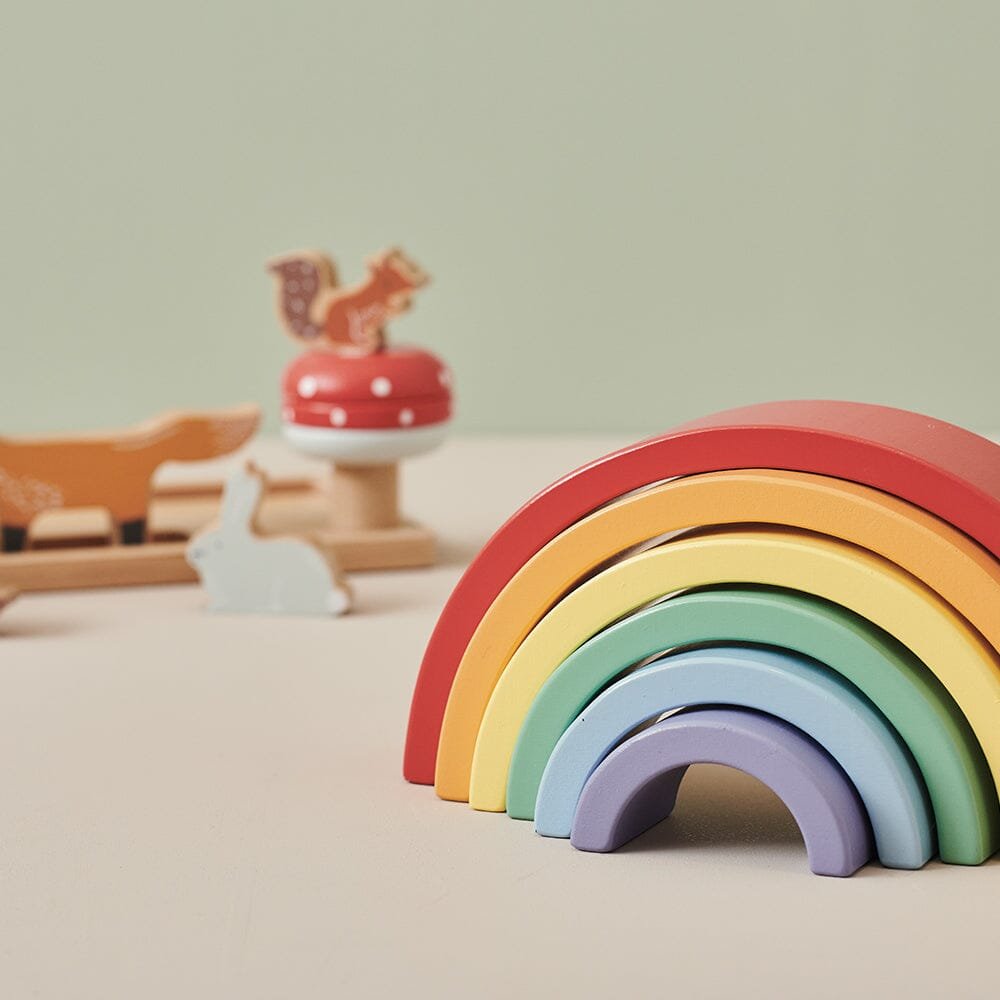 Our colourful 3-in-1 Rainbow Nursery Toy is perfect for their first few months and beyond. Each element is carved from smooth wood making them equally safe and tactile. There’s a beautiful stacking rainbow for babies, plus a stacking tree and mushroom for slightly older tots getting to grips with all-important pincer movements. To aid further development of fine motor skills, we’ve also included a set of hand-painted animals that are purposely trickier to stack and guarantee to produce lots of giggles when they tumble!