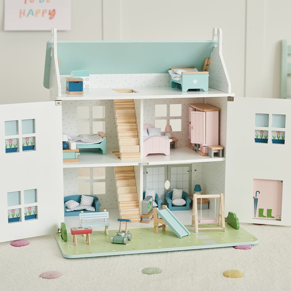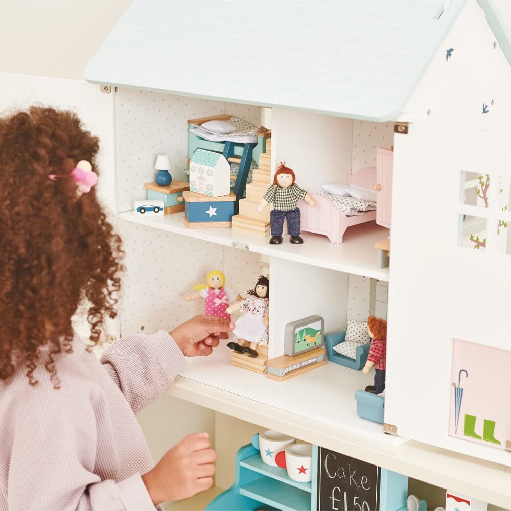 We love the charming painted details on the walls – birds tweeting, flowers blooming – there’s so much to spark your child’s imagination. It’s a wonderful future heirloom piece. Complete the set-up with our hand-painted family characters, garden furniture set and indoor doll house accessories, all available separately.